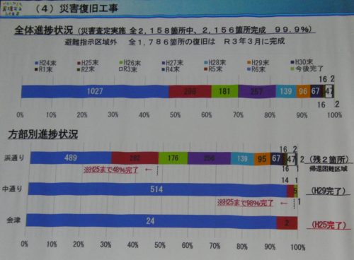 災害復旧工事の県内全体の進捗(写真3)については、①復興・創生を支援する道路整備 ②津波被災地の復興 ③原子力災害による避難者の住宅確保の3点について状況を報告いただきました。