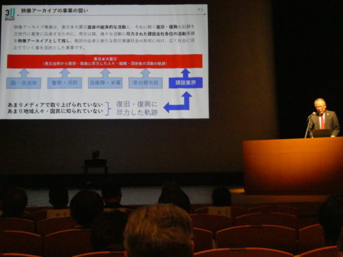 続いて活動報告に移り、一般財団法人3.11伝承ロード推進機構の原田吉信氏(写真4)が、建設業の活躍が「中々メディアに取り上げられていない。残念な思い」とし、震災の映像アーカイブから2本の紹介がありました。1本目は孤立した地元の被災地に自ら決断してライフラインを開通させた宮城県の武山工業の記録、続いて大津波警報発令中にがれきに埋もれた国道45号の早期啓開を行った岩手県の刈屋建設の記録です。自衛隊などの救援隊の通り道を切り開くため、ご遺体が隠れているかもしれない倒壊現場で重機を動かすオペレーターの苦痛と昼夜を問わずの突貫工事、自分の家族や親せきの安否確認もままならない中で作業をする建設業の皆さん、その指揮を執る上司の皆さん、短い上映でしたがハンカチが離せませんでした。