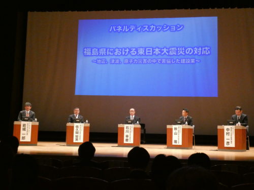 最後に、「福島県における東日本大震災の対応~地震、津波、原子力災害の中で苦悩した建設業~」をテーマに、パネルディスカッション(写真5)がありました。パネリストは、県内の建設業関係者3名と県土木部企画課長の4名。まとめとして、コーディネーターの日大工学部の岩城一郎教授は、「東日本大震災時に国交省東北整備局が実施した『くしの歯作戦』の成功は、建設業の矜持。国民の理解に向けて発信していかなければならない」と締めくくりました。