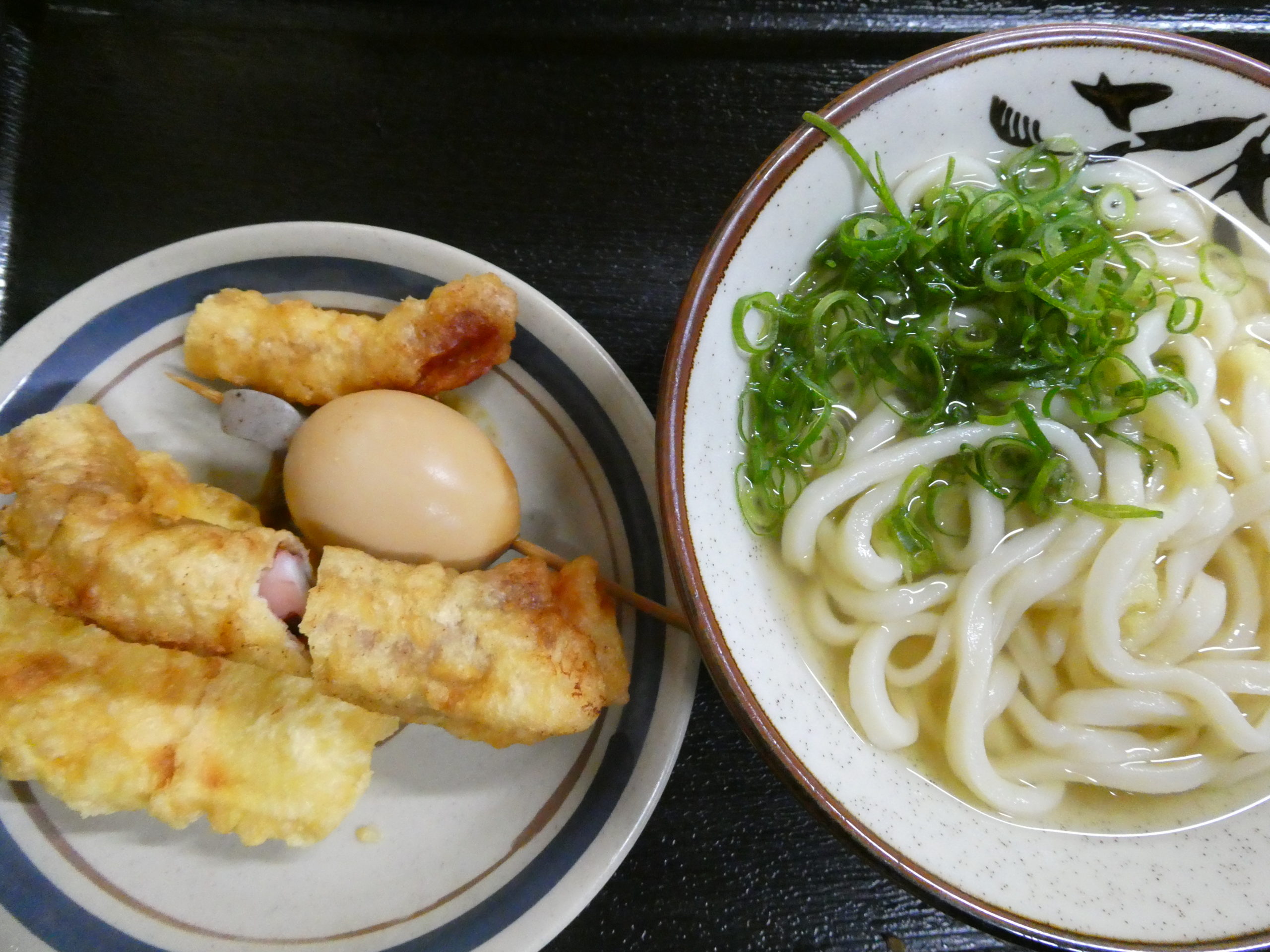 現存する日本最古の芝居小屋『旧金毘羅大芝居(金丸座)』の視察の帰道。ワゴン車で送ってくれた琴平町職員の方のおススメのうどん店へ直行しました。JR琴平駅から徒歩5分ほどのうどん店「いわのや」です。間口2間ほど。入口は狭いが、店内は奥行きがあり、かけうどんを注文して職員おススメのイカゲソ天ぷら、おでんなどをセルフで皿に取り、レジで精算。レジの奥さん(?)のアドバイスで、大きなゲソ1本を置いてあった調理ばさみでカットして、テーブルへ移動。美味しくいただきました。本場の讃岐うどんは、感動モノでしたヨ。